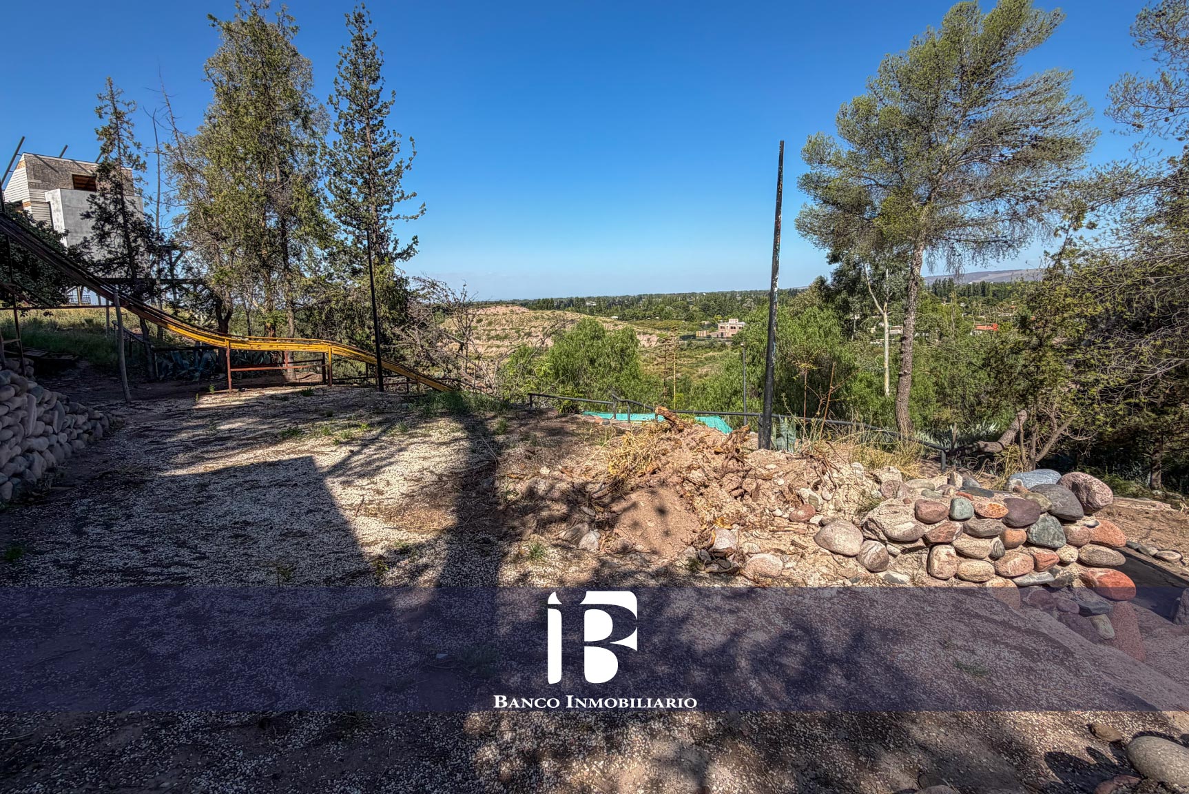 Jardín con vegetación añosa en parte trasera con estructura tipo quincho.